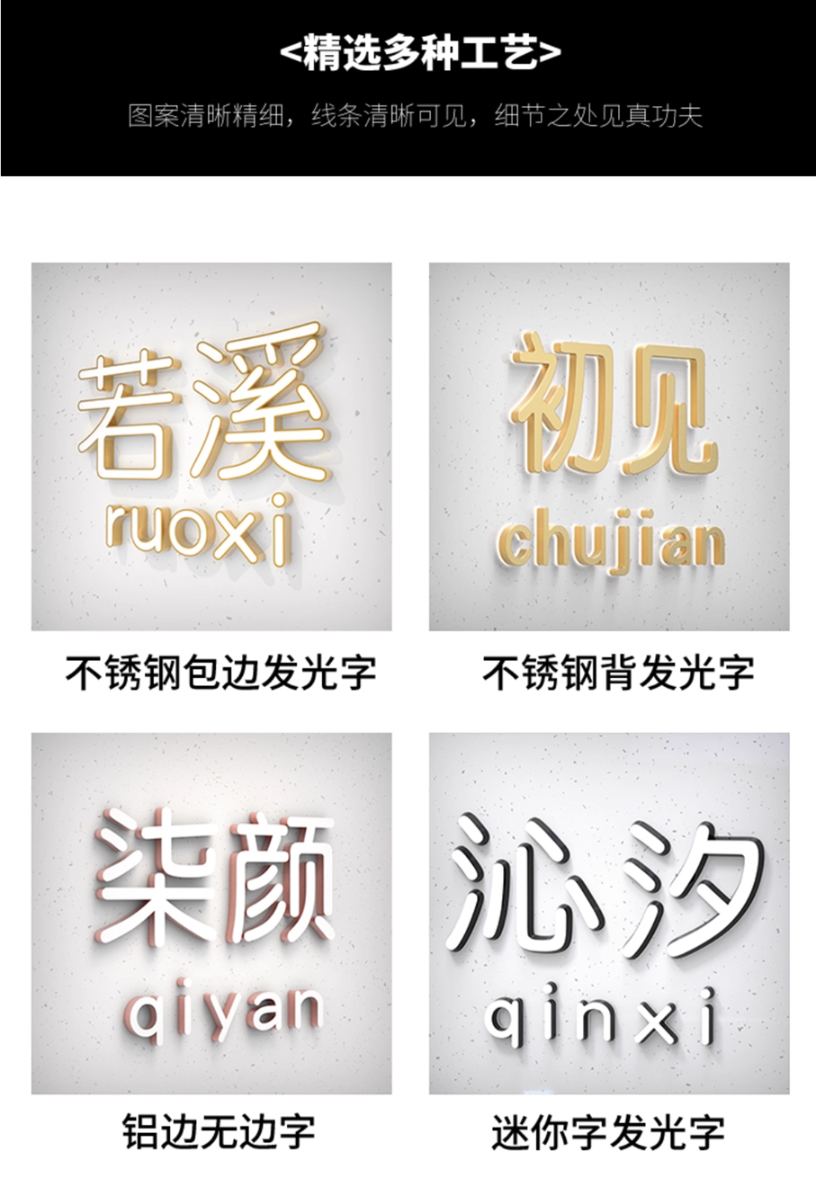 - 全材质覆盖:精通亚克力、不锈钢、迷你字、无边字等10+主流发光字工艺,满足不同场景视觉需求。